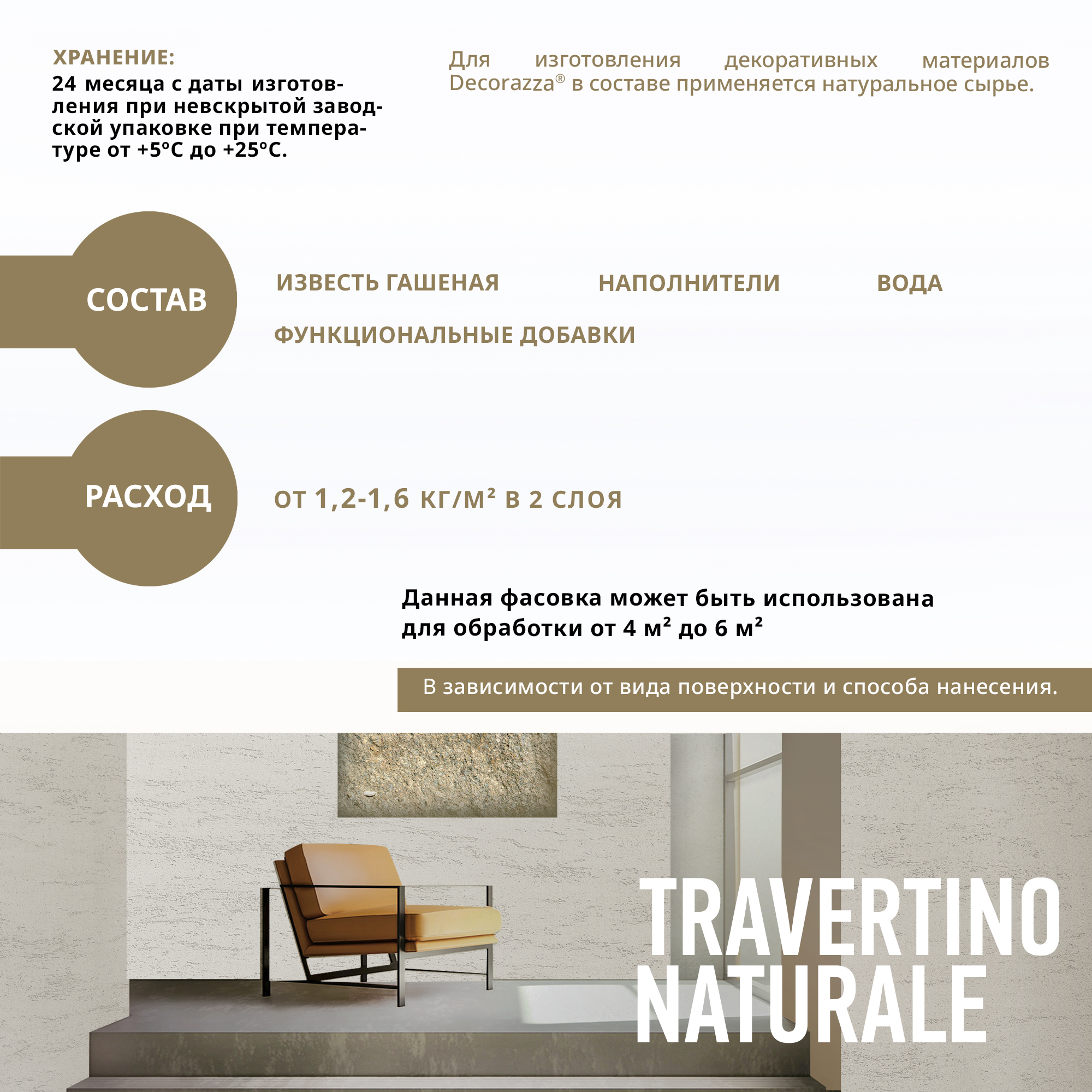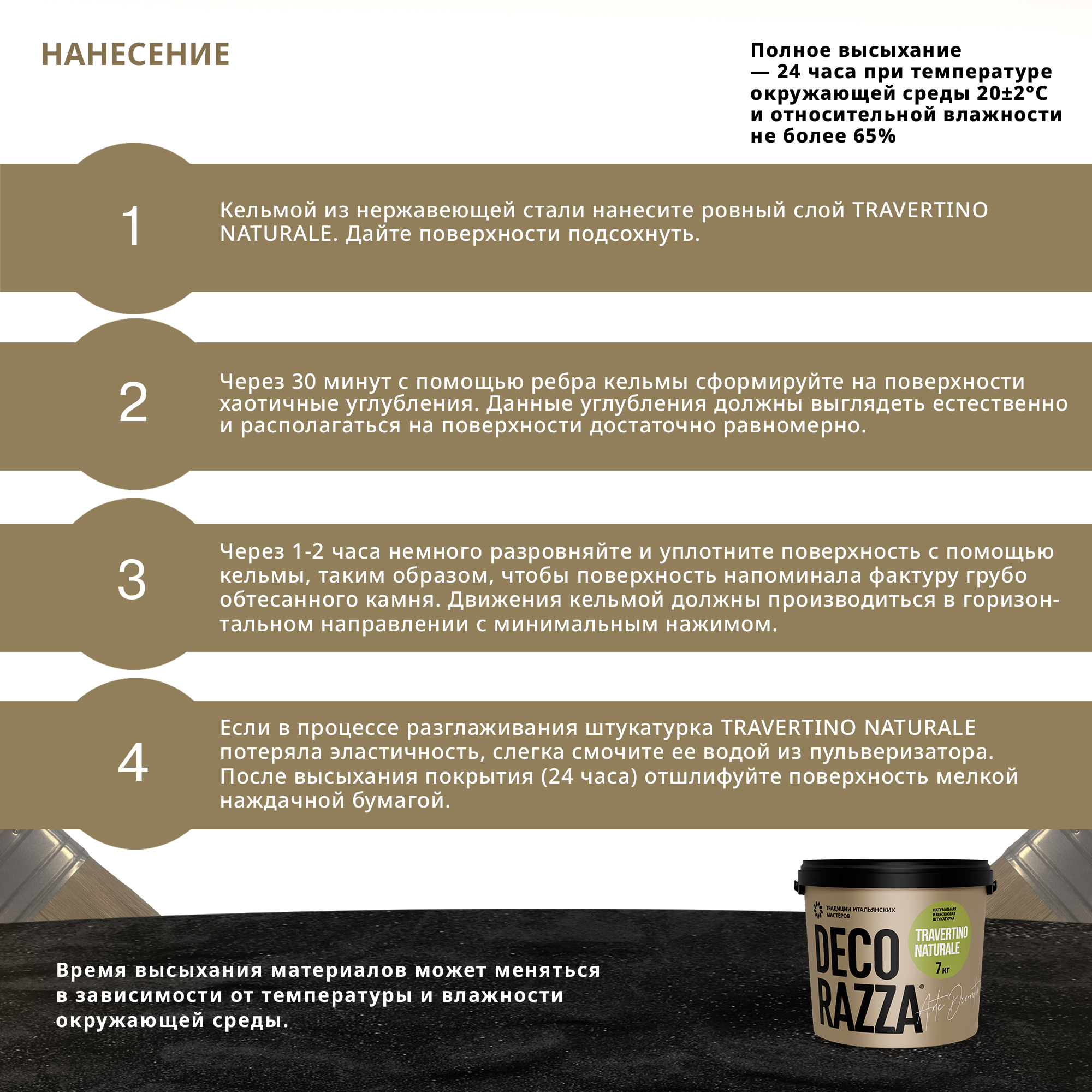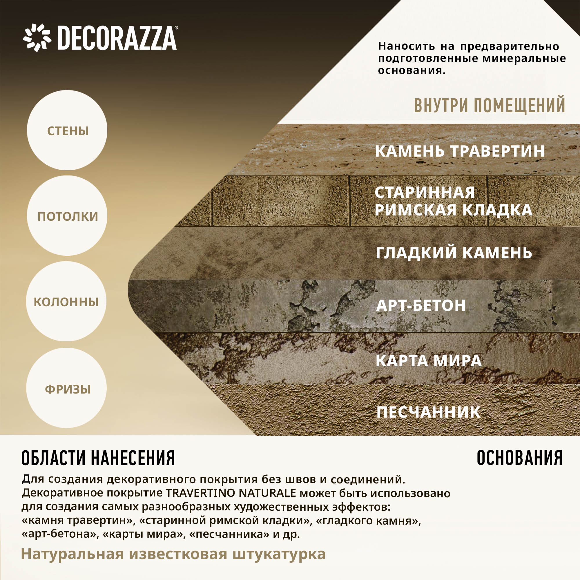 Тип продукта: Декоративное покрытие Travertino naturale - Штукатурка для создания декоративного покрытия без швов и соединений на стенах, потолках, колоннах, фризах и других архитектурных деталях внутри помещений