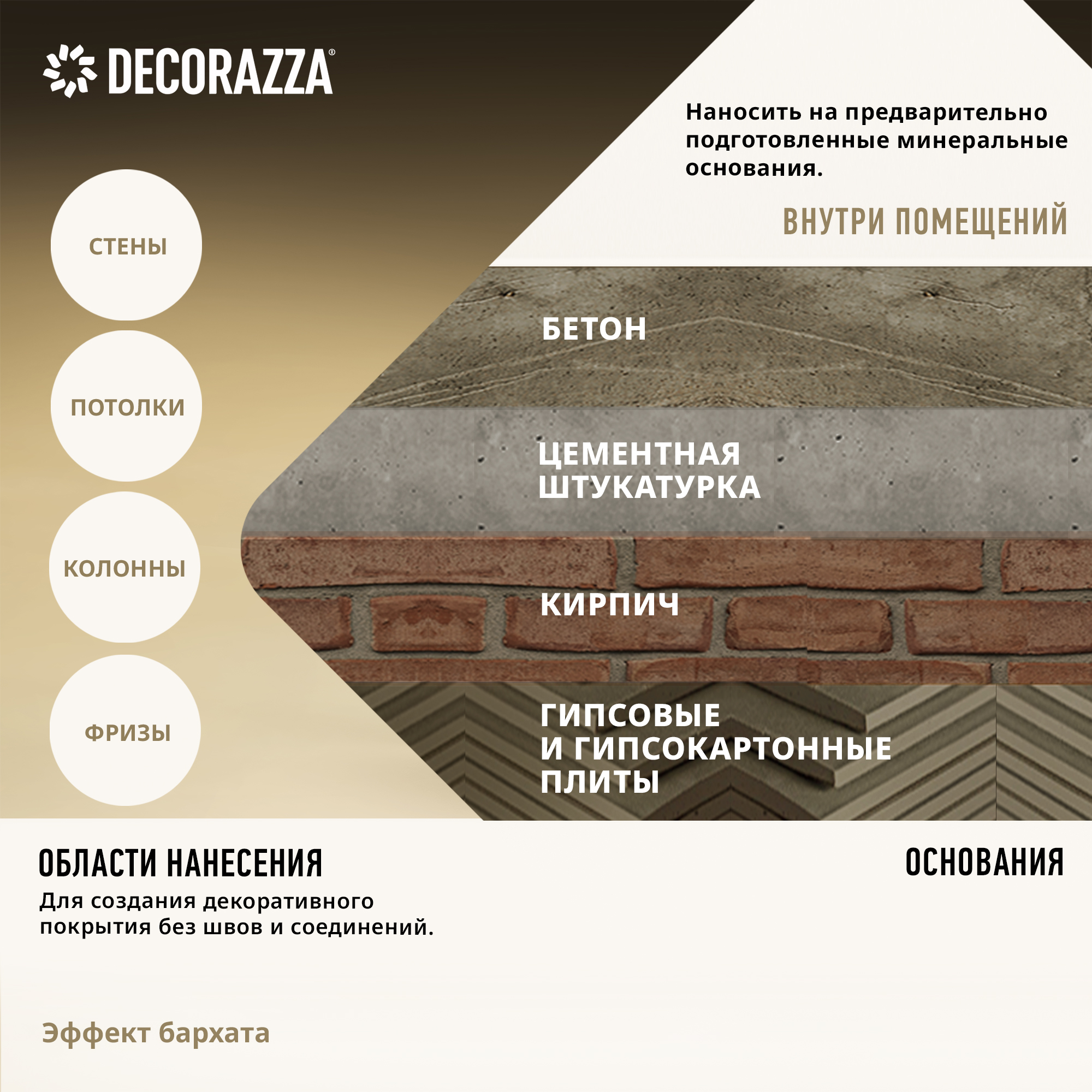 Для создания декоративного покрытия без швов и соединений на стенах, потолках, колоннах, фризах и других архитектурных деталях внутри помещений.