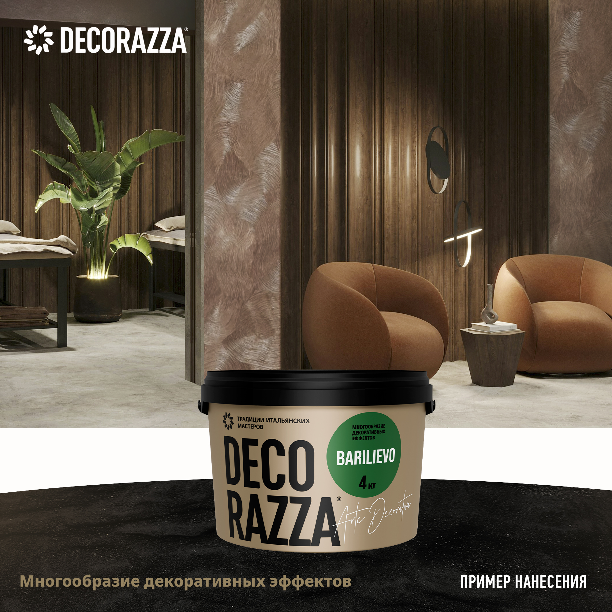 Высокопластичная декоративная штукатурка с эффектом ткани, бетона, марокканской штукатурки, металлических листов, камня и других поверхностей предназначена исключительно для внутренней отделки. Материал Barilievo обеспечивает простоту нанесения и минимальный расход за счет пластичности продукта и отсутствия необходимости идеального выравнивания основания шпаклевкой. Формирует безупречное покрытие без швов и стыков, не требующее особого ухода. Продукт подходит для отделки помещений в африканском, средиземноморском, минималистичном, гранжевом и других стилях.
