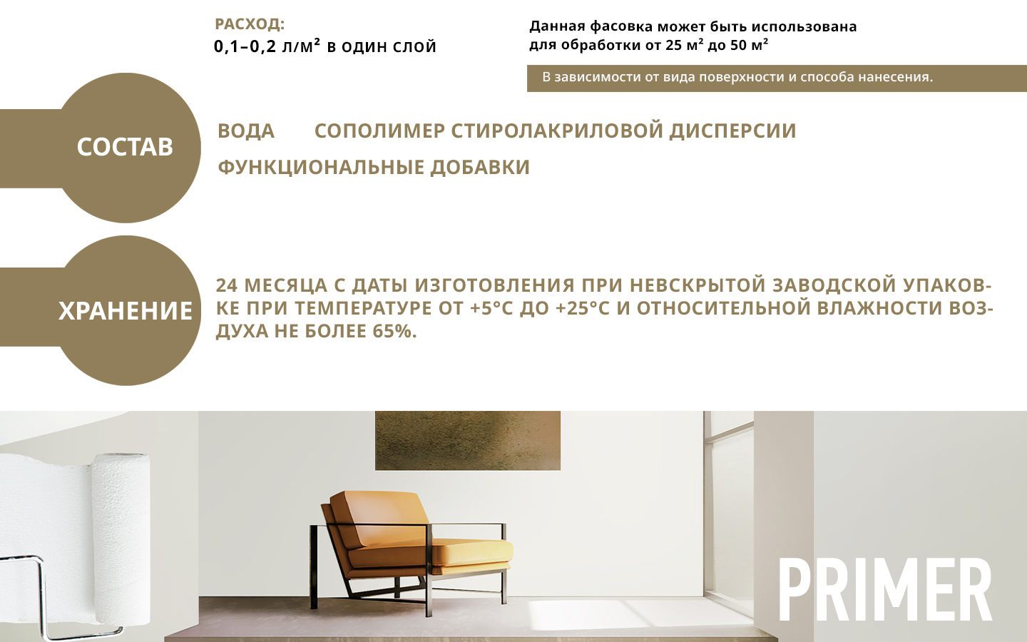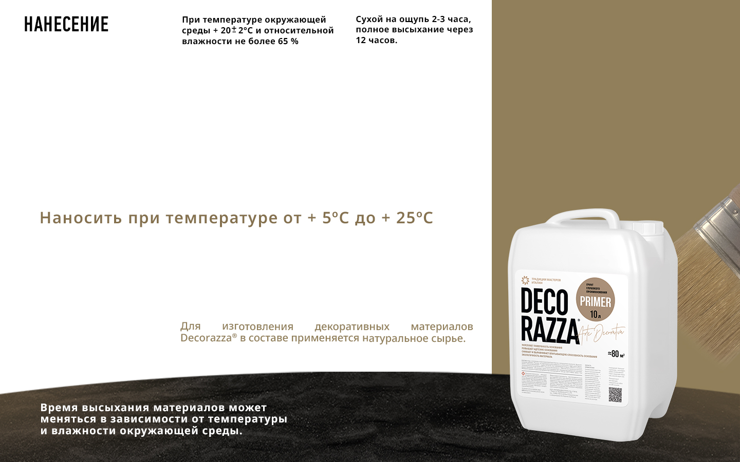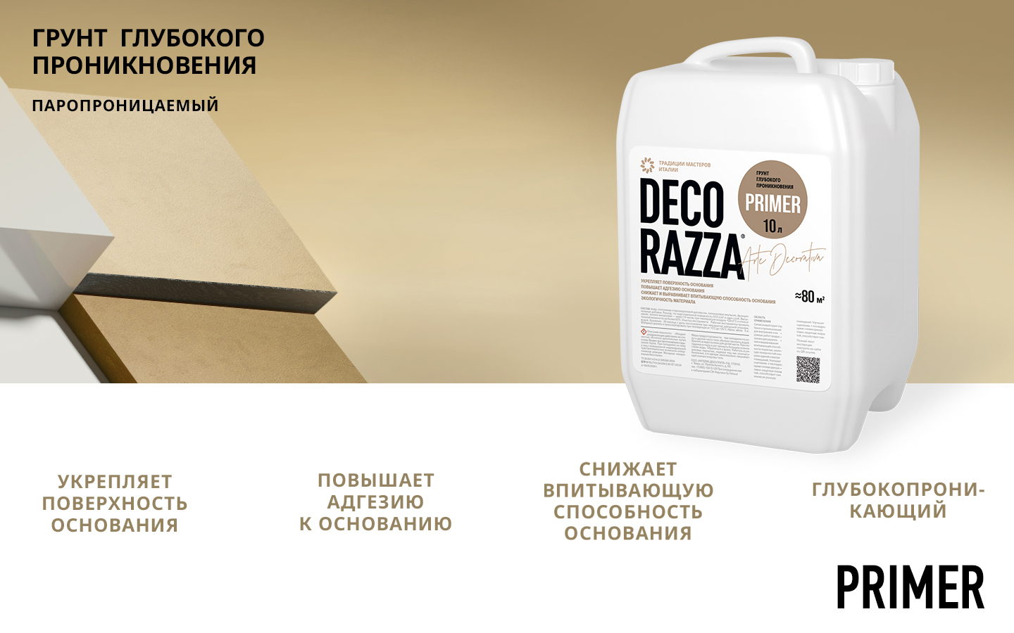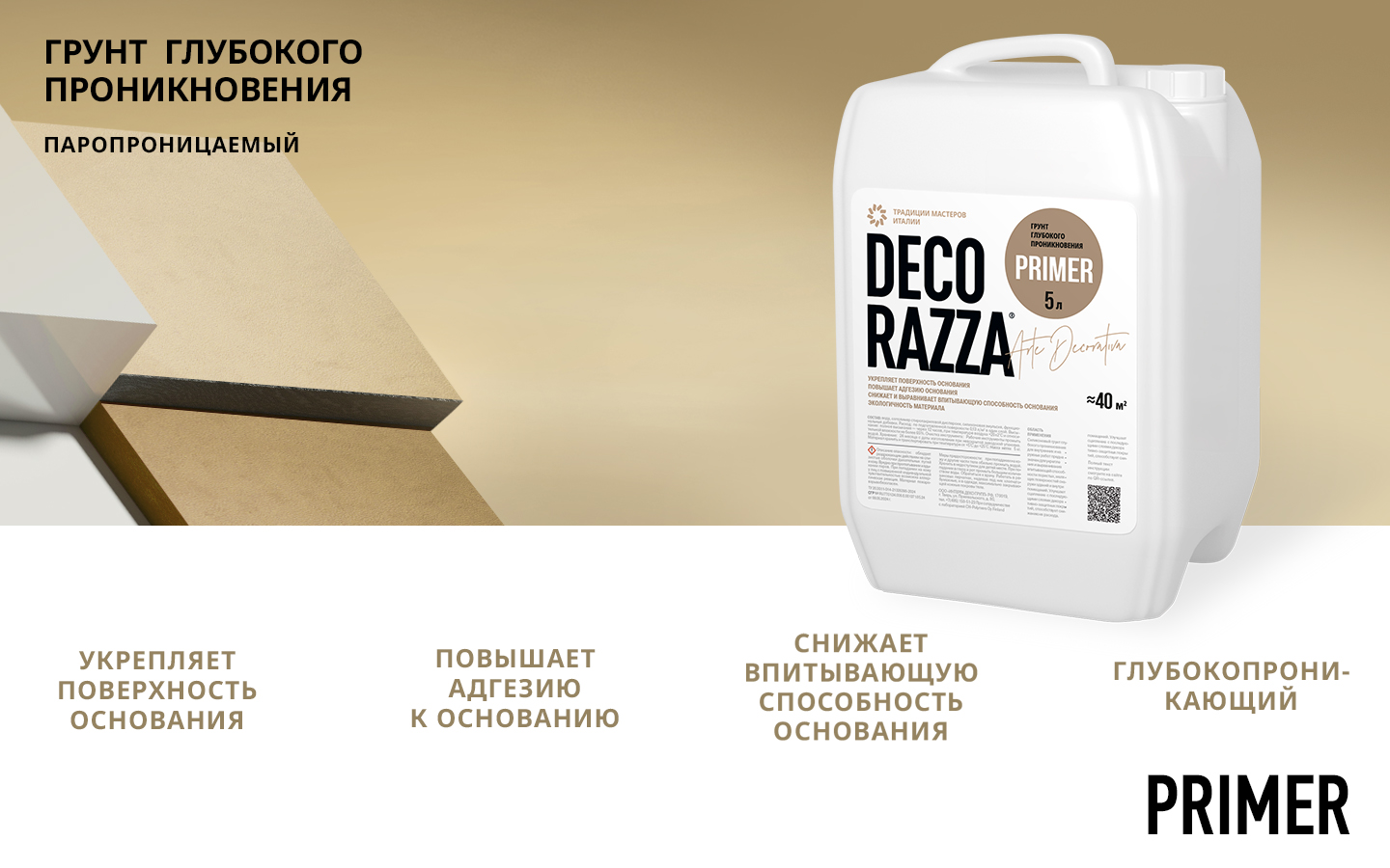 Тип продукта: Грунт глубокого проникновения PRIMER - Грунт Decorazza PRIMER — это высококачественная акриловая грунтовка, специально разработанная для минеральных поверхностей, таких как бетон, кирпич и штукатурка. Этот грунт обладает уникальной способностью глубокого проникновения, обеспечивая надежное сцепление с основанием и значительно повышая адгезию декоративной краски или покрытия. Decorazza PRIMER отличается от других грунтов отсутствием неприятного запаха, что делает его идеальным выбором для помещений, где важна комфортная атмосфера. Его укрепляющие свойства обеспечивают долговечность и прочность отделки, делая поверхность устойчивой к механическим воздействиям и погодным условиям. Этот грунт идеально подходит для подготовки основания перед нанесением декоративных покрытий, обеспечивая безупречную гладкость и однородность цвета. Decorazza PRIMER гарантирует качественную основу для любых декоративных работ, делая их долговечными и эстетичными.