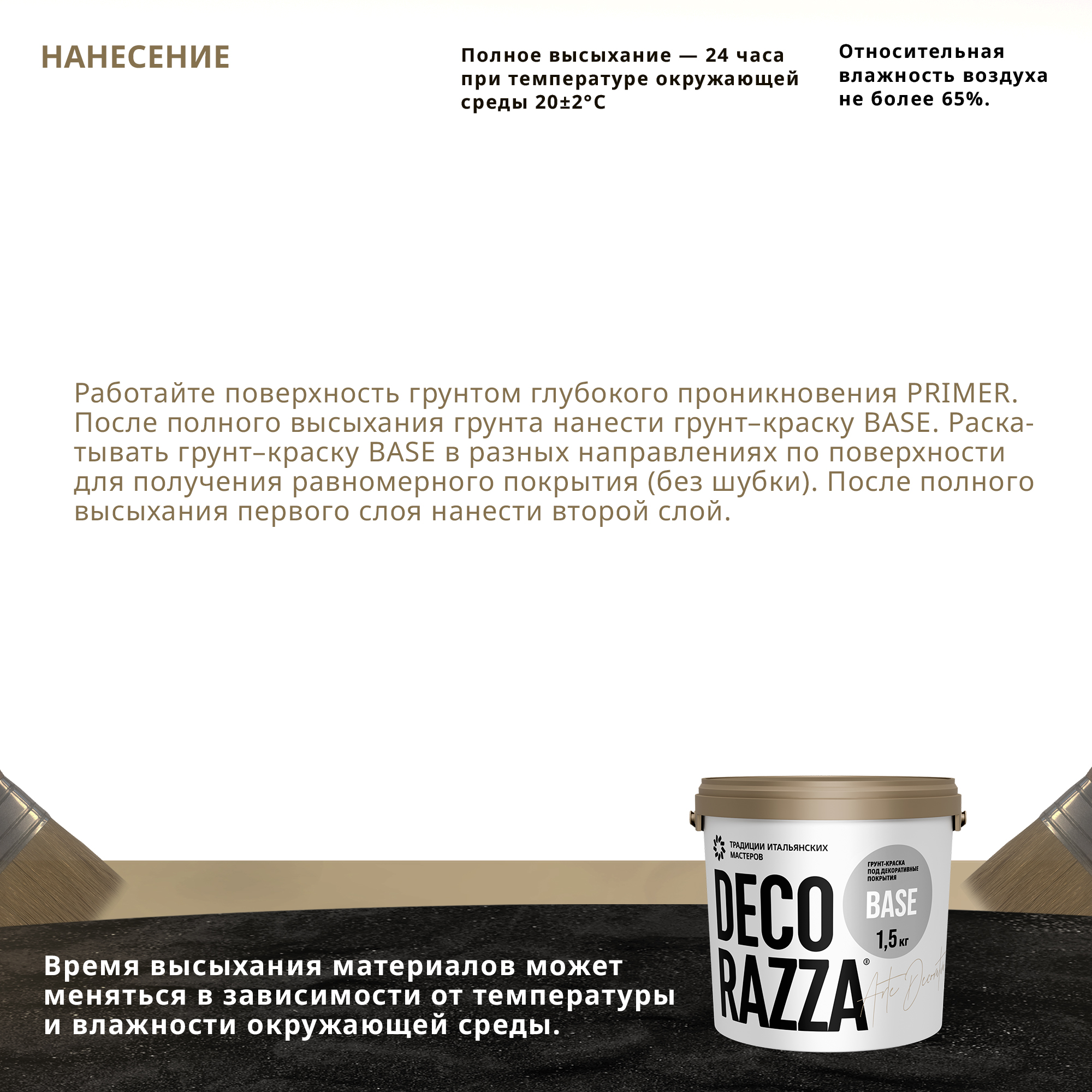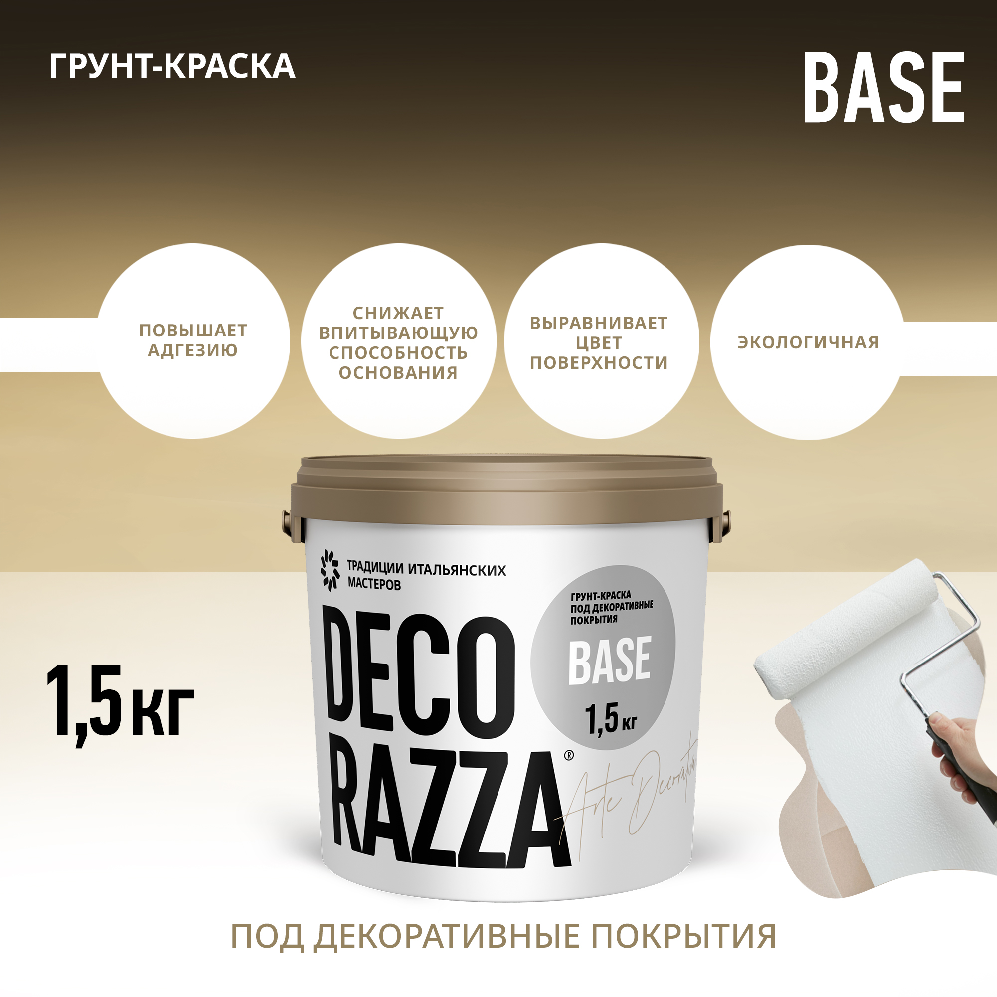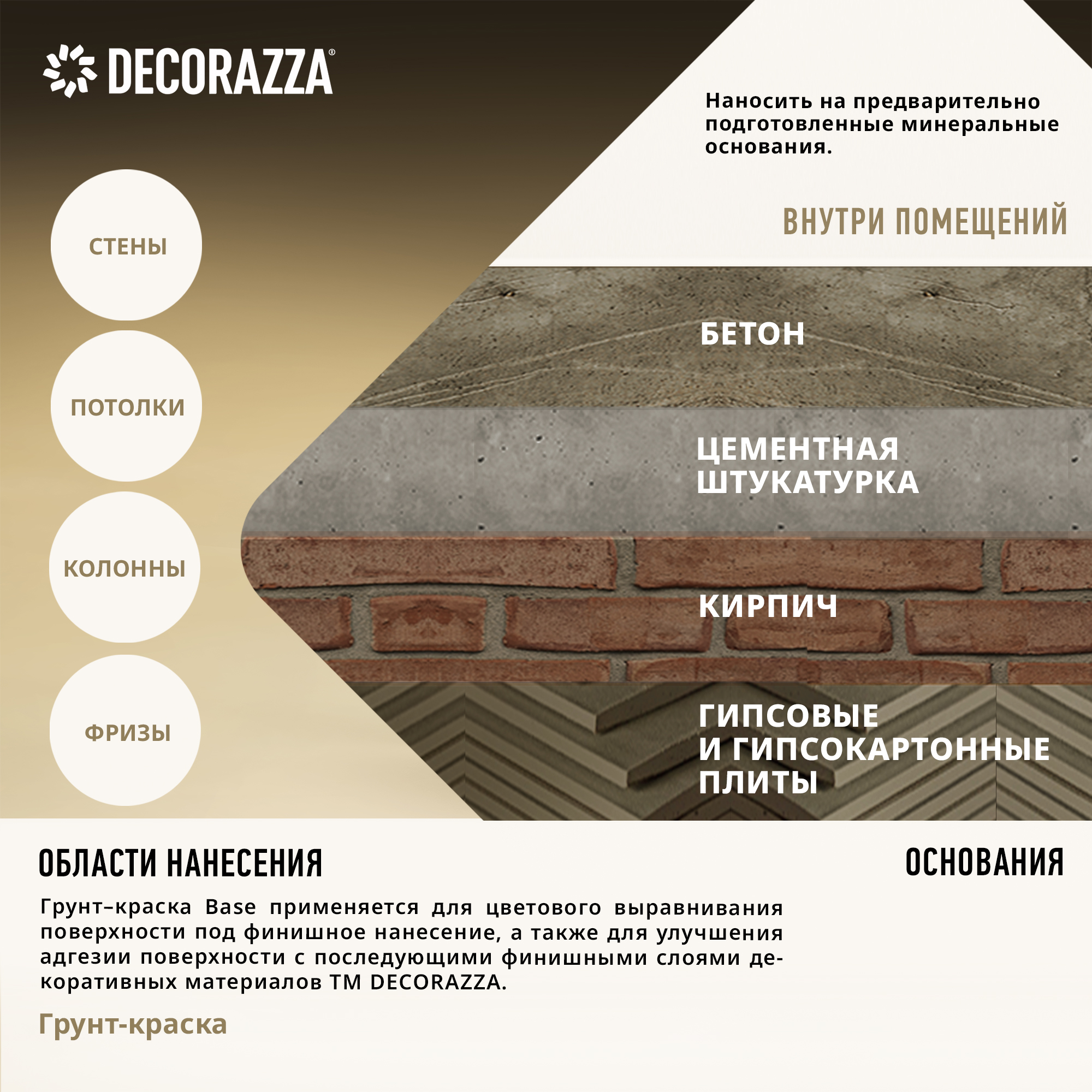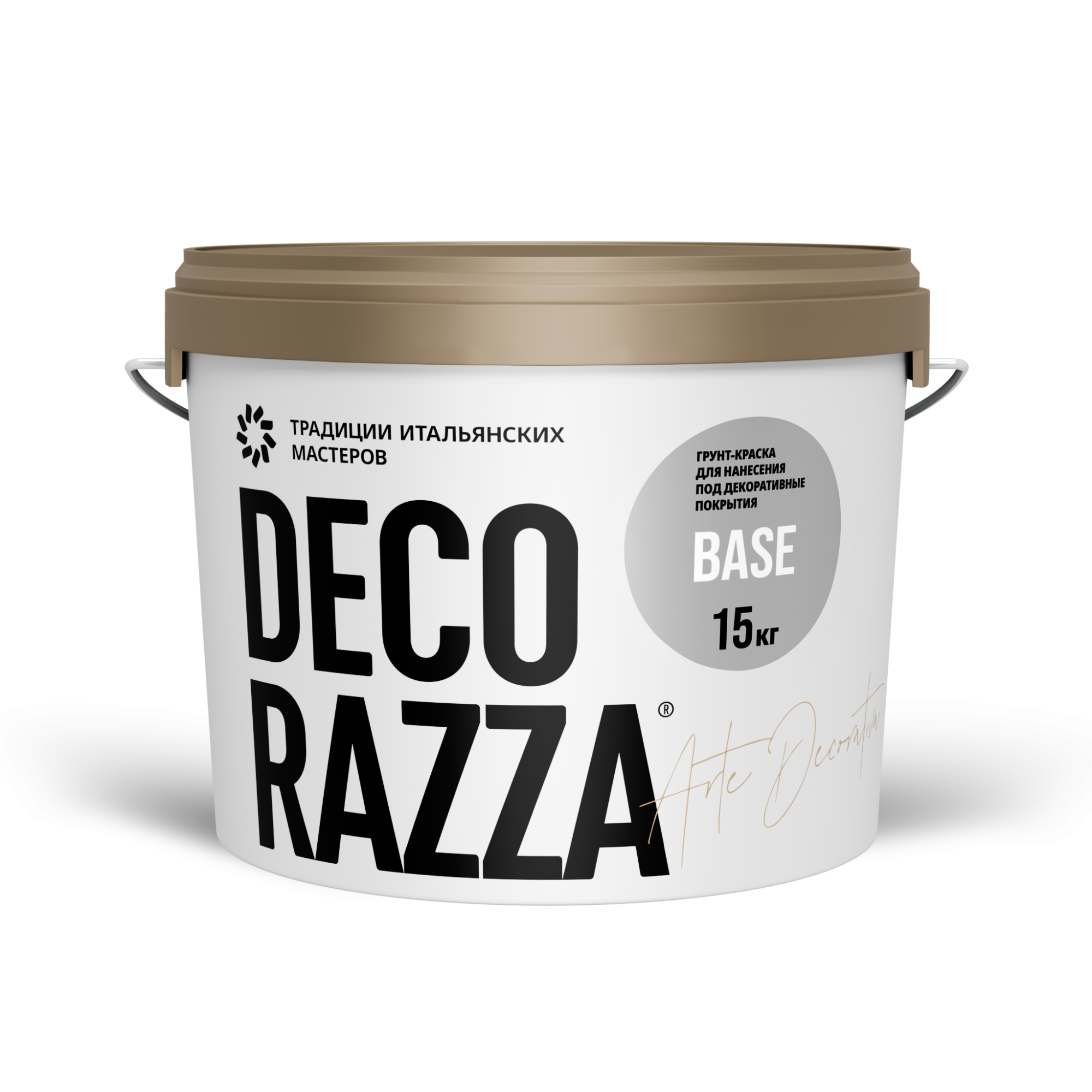 Для внутренних работ. Грунт-краска Base применяется для цветового выравнивания поверхности под финишное нанесение, а также для улучшения адгезии поверхности с последующими финишными слоями декоративных материалов ТМ Decorazza.