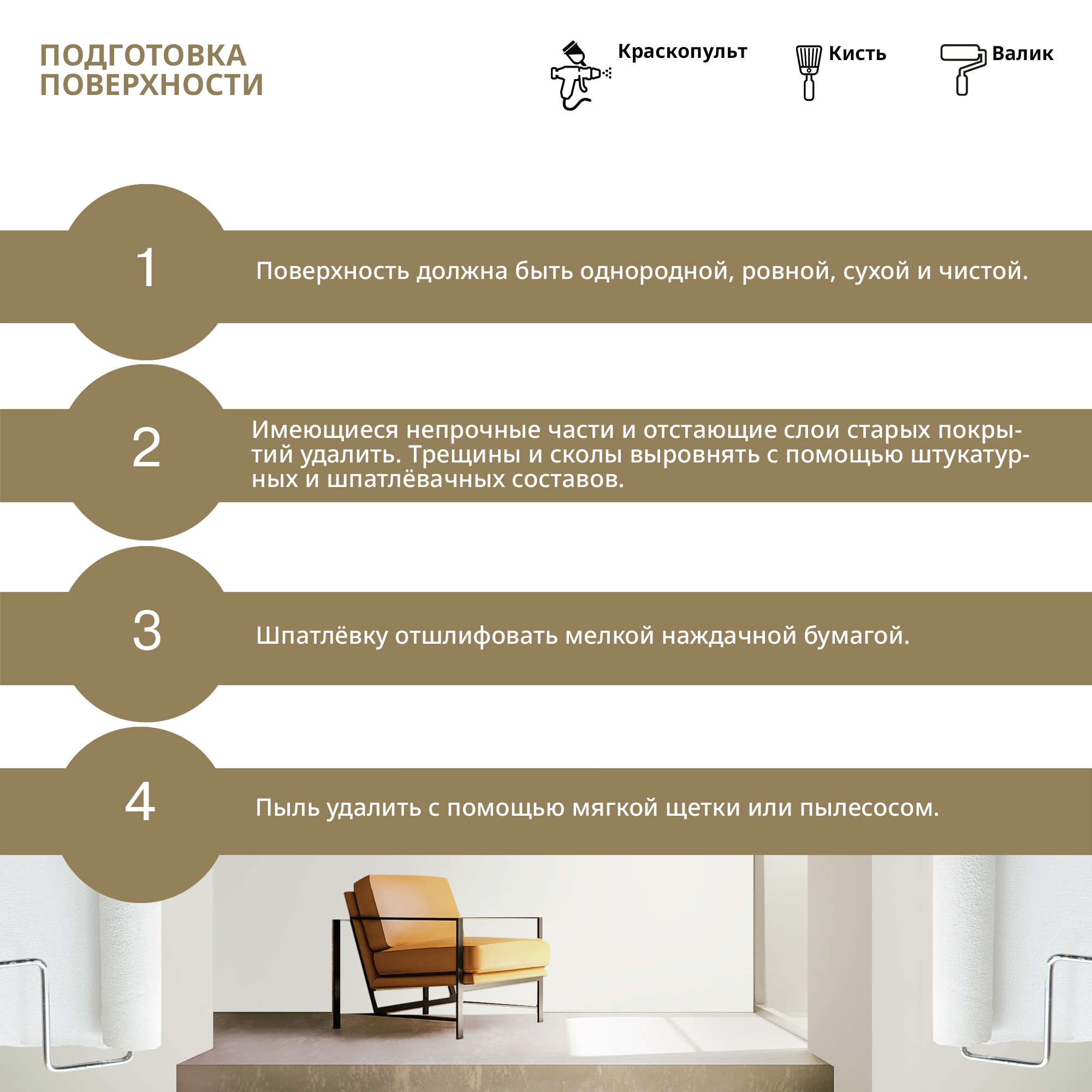 Поверхность должна быть однородной, выровненной, высохшей и чистой. Имеющиеся непрочные части и отстающие слои старых покрытий удалить. Трещины и сколы выровнять с помощью штукатурных или шпаклевочных составов. Шпатлевку отшлифовать мелкой наждачной бумагой. Пыль удалить с помощью мягкой щетки или пылесосом.
