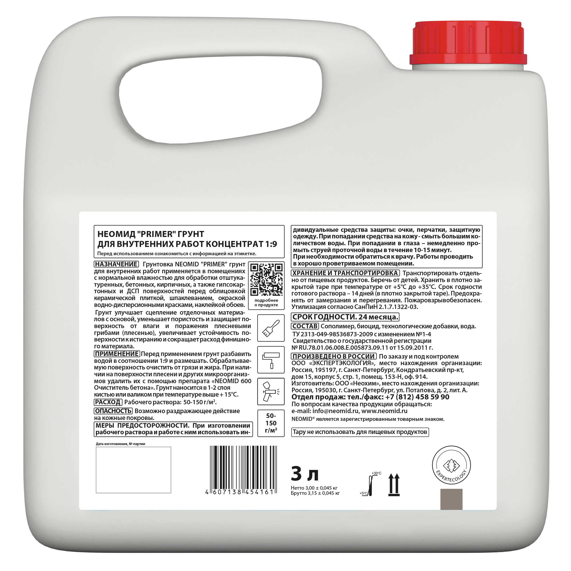 СПОСОБ ПРИМЕНЕНИЯ: Перед применением грунт разбавить водой в соотношении 1:9 и размешать. Обрабатываемую поверхность очистить от грязи и жира. При наличии на поверхности плесени и других микроорганизмов удалить их с помощью препарата «NEOMID 600 Очиститель бетона». Грунт наносится в 1-2 слоя кистью или валиком при температуре выше + 15°С.