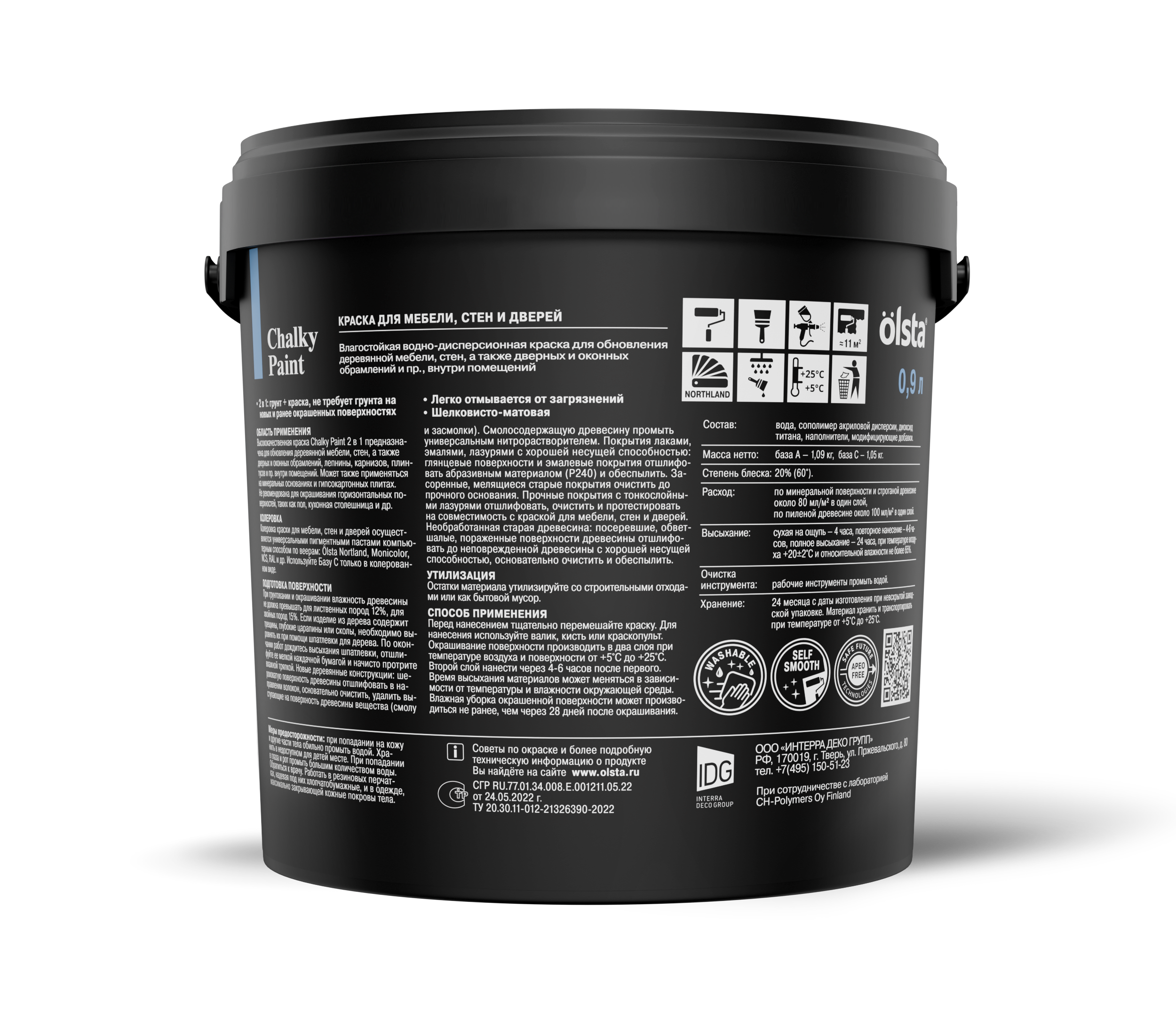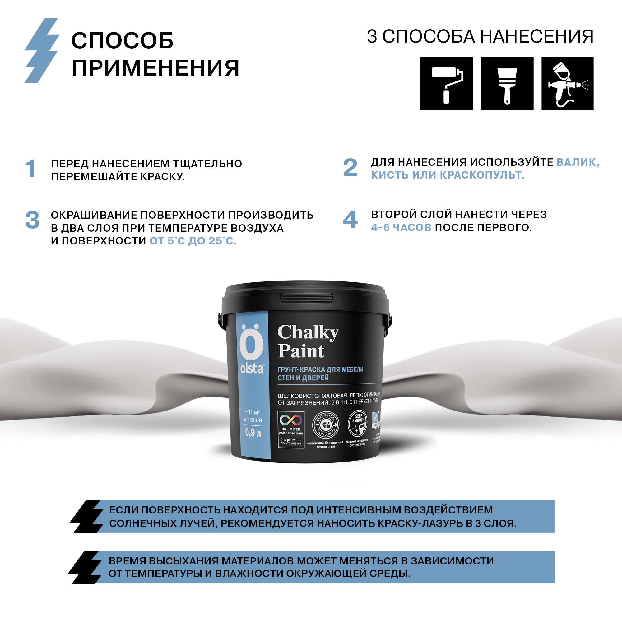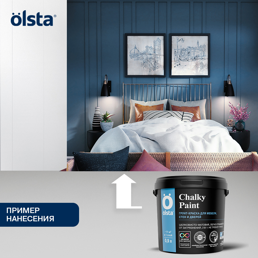 Тип продукта: Краска для мебели меловая CHALKY PAINT - Краска для мебели меловая OLSTA CHALKY PAINT — это непревзойденное решение для тех, кто мечтает о стильной и долговечной мебели без лишних хлопот. Эта мебельная краска обладает уникальной матовой текстурой, напоминающей натуральный мел, что придает поверхности уютный и элегантный вид. Экологичная формула на водной основе гарантирует отсутствие неприятного запаха, делая процесс окрашивания комфортным как для вас, так и для вашего дома. OLSTA CHALKY PAINT отличается своей стойкостью к износу, обеспечивая долгие годы безупречного вида вашей мебели. Благодаря возможности колерования, вы можете подобрать идеальный оттенок под любой интерьер, создавая неповторимую атмосферу в каждом уголке вашего пространства. Используйте эту краску для обновления старых вещей или придания оригинальности новым предметам мебели, наслаждаясь безопасностью и качеством продукта, который отвечает всем современным требованиям экологии и дизайна.