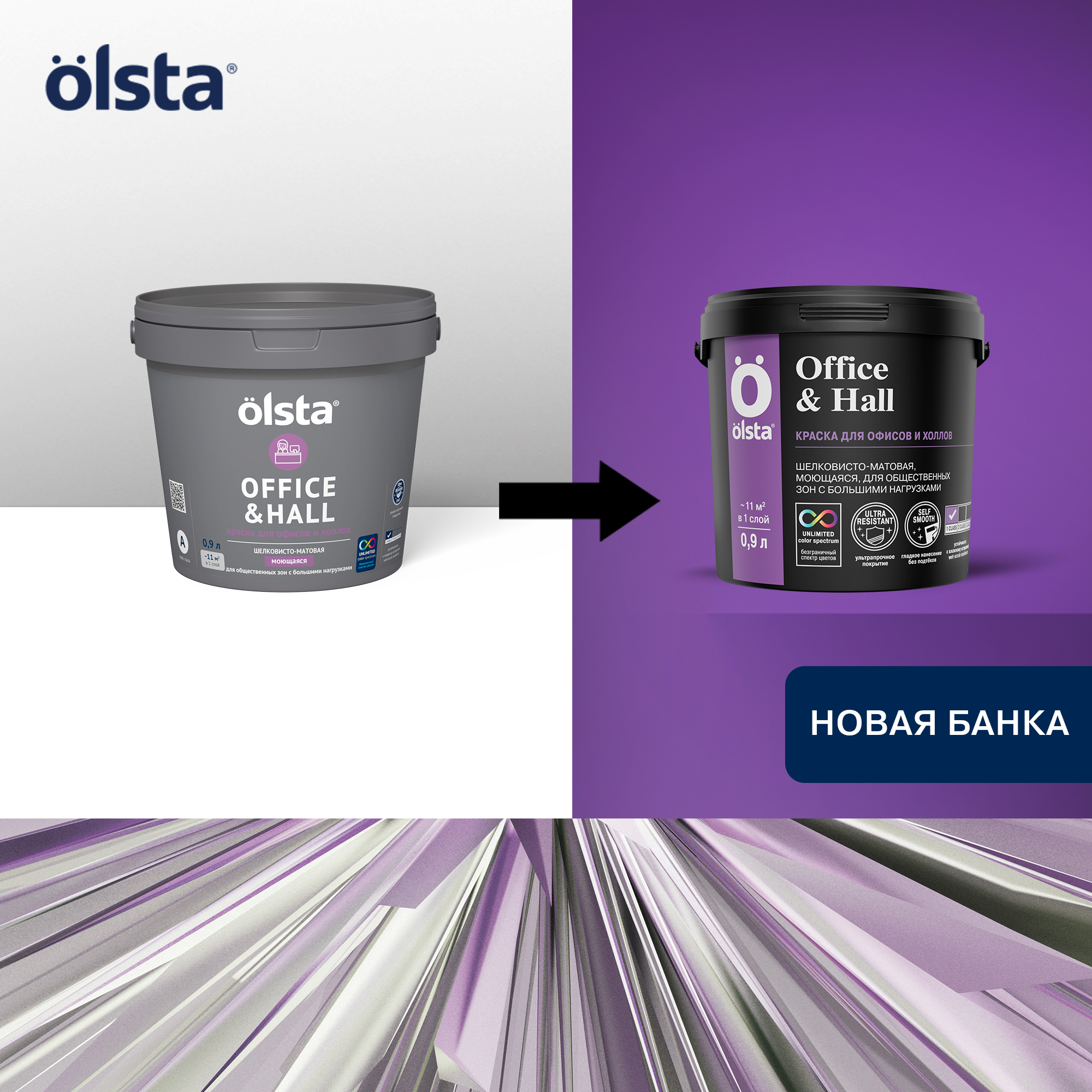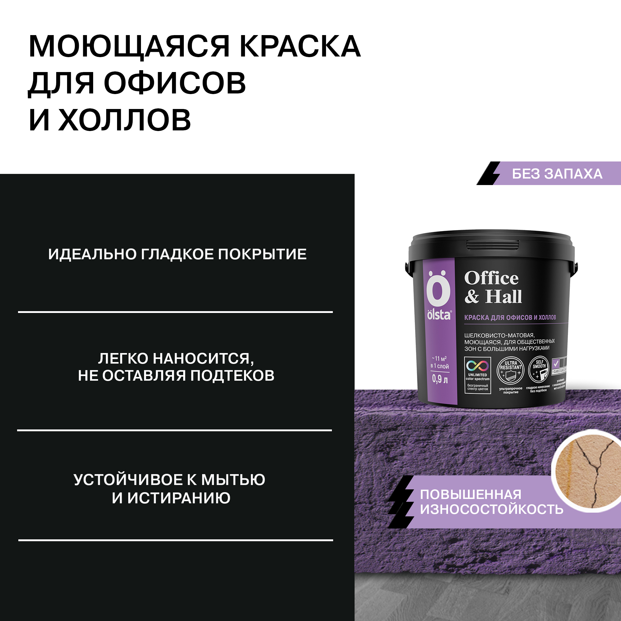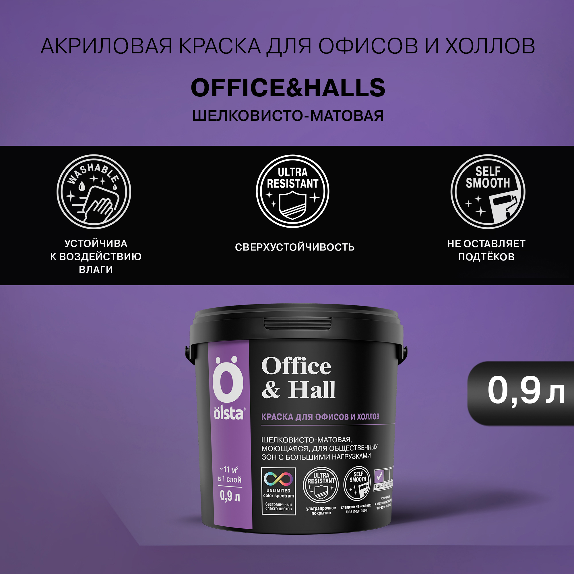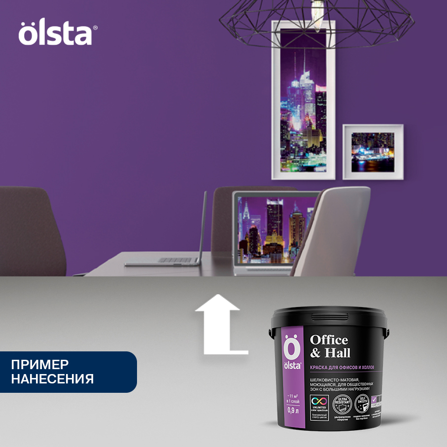 Изготовленная по особой технологии с повышенным количеством акрилового связующего краска Olsta Office & Hall обеспечивает высококачественное окрашивание стен в вестибюлях, офисах, холлах и на других объектах, предполагающих высокую эксплуатационную нагрузку. Материал создает матовое влагостойкое покрытие, отличающееся паропроницаемостью, простотой ухода, устойчивостью к мытью и истиранию.