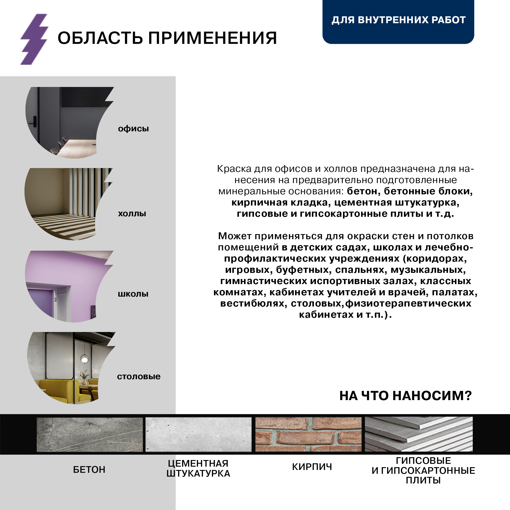 Краска для офисов и холлов предназначена для нанесения на предварительно подготовленные минеральные основания: бетон, бетонные блоки, кирпичная кладка, цемент, цементная штукатурка, гипс, гипсовые и гипсокартонные плиты и т.д.