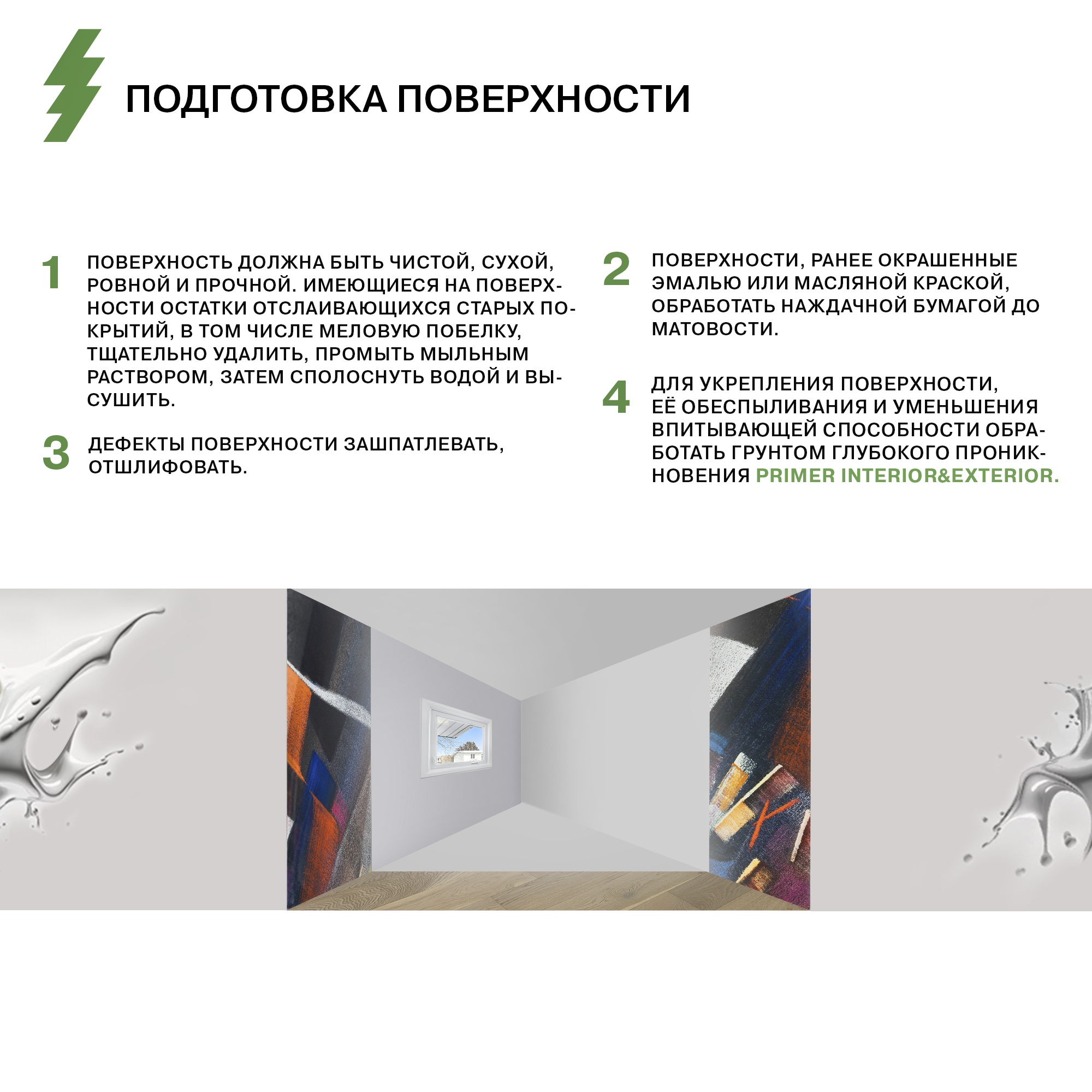 Водно-дисперсионная краска, обладающая хорошей укрывистостью, предназначена для внутренней окраски стен и потолков, а также обоев в жилых и общественных помещениях.