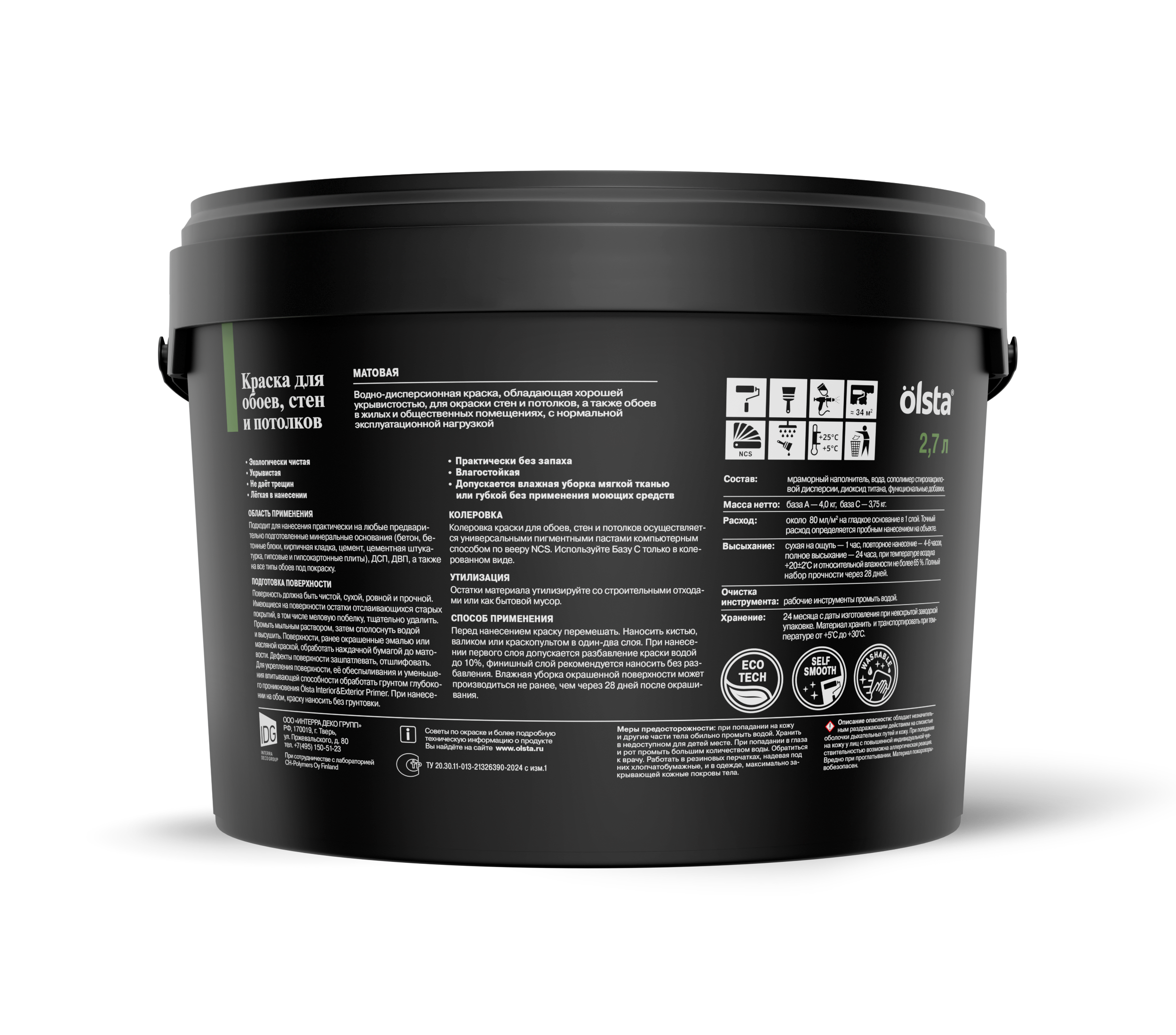 Тип продукта: Краска для стен, обоев и потолков - Водно-дисперсионная краска, обладающая хорошей укрывистостью, предназначена для внутренней окраски стен и потолков, а также обоев в жилых и общественных помещениях.