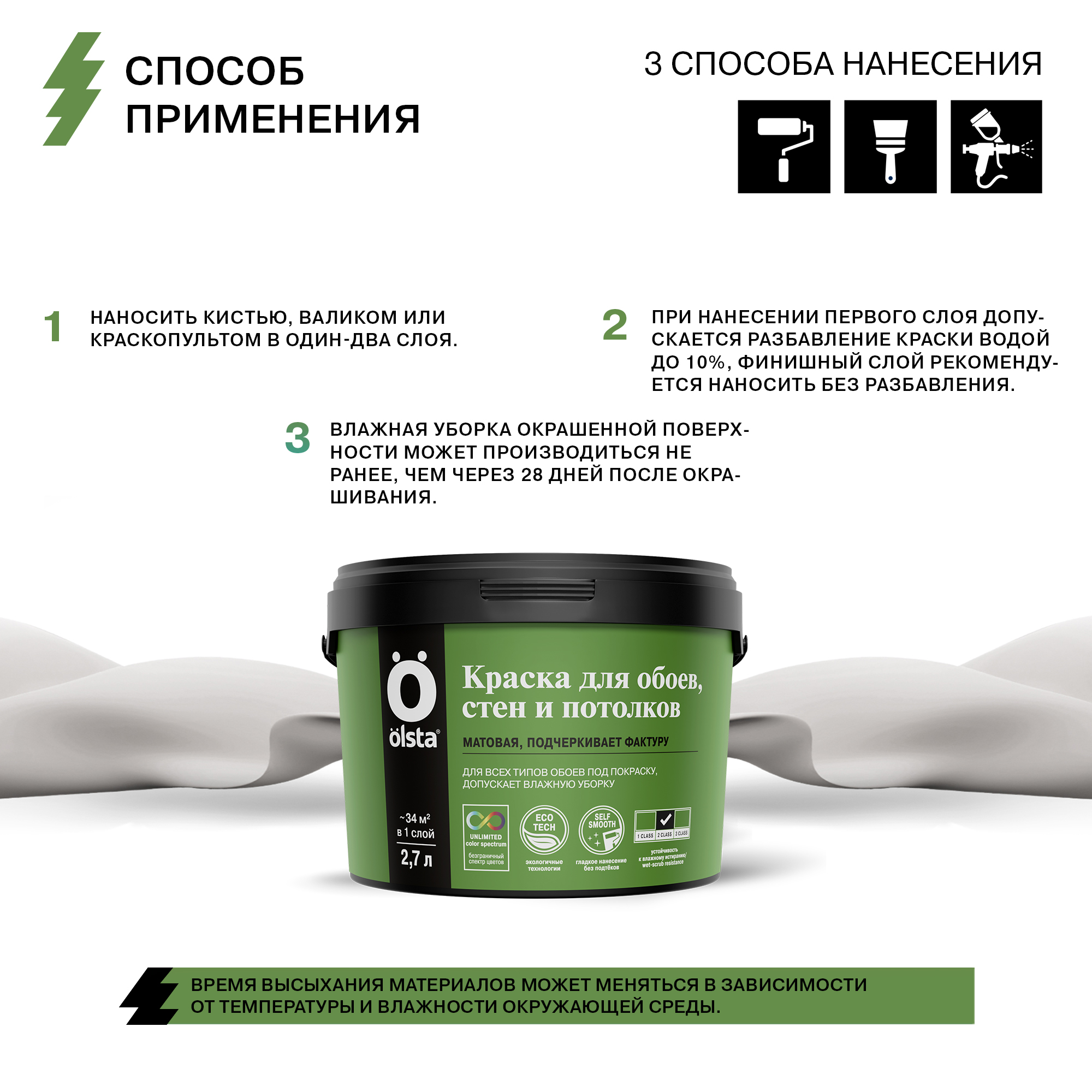 Поверхность должна быть чистой, сухой, ровной и прочной. Имеющиеся на поверхности остатки отслаивающихся старых покрытий, в том числе меловую побелку, тщательно удалить. Промыть мыльным раствором, затем сполоснуть водой и высушить. Поверхности, ранее окрашенные эмалью или масляной краской, обработать наждачной бумагой до матовости. Дефекты поверхности зашпатлевать, отшлифовать. Для укрепления поверхности, её обеспыливания и уменьшения впитывающей способности обработать грунтом глубокого проникновения Olsta Interior&Exterior Primer.