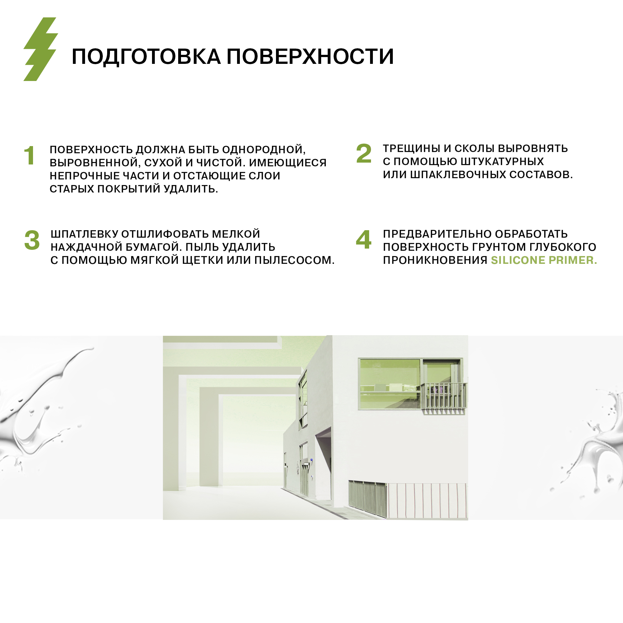 Краска фасадная силиконовая предназначена для нанесения на предварительно подготовленные минеральные основания: бетон, бетонные блоки, кирпичная кладка, цемент, цементная штукатурка, гипс, гипсовые и гипсокартонные плиты и т.д.