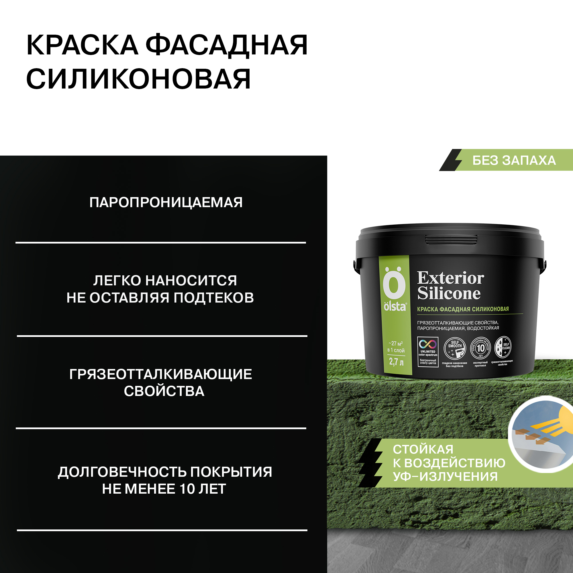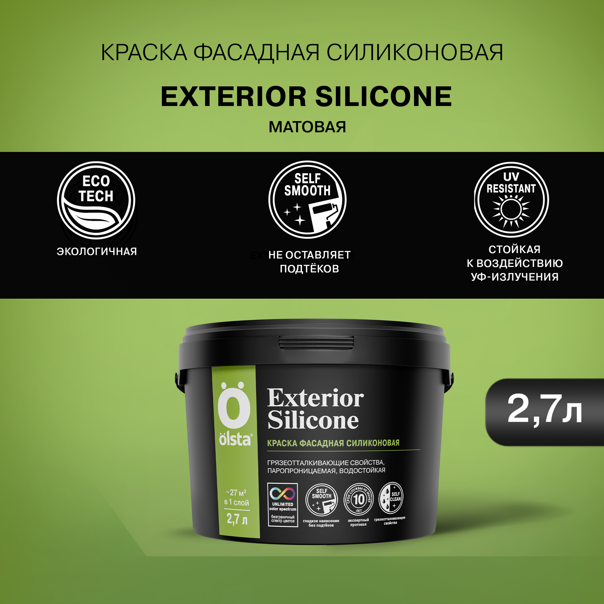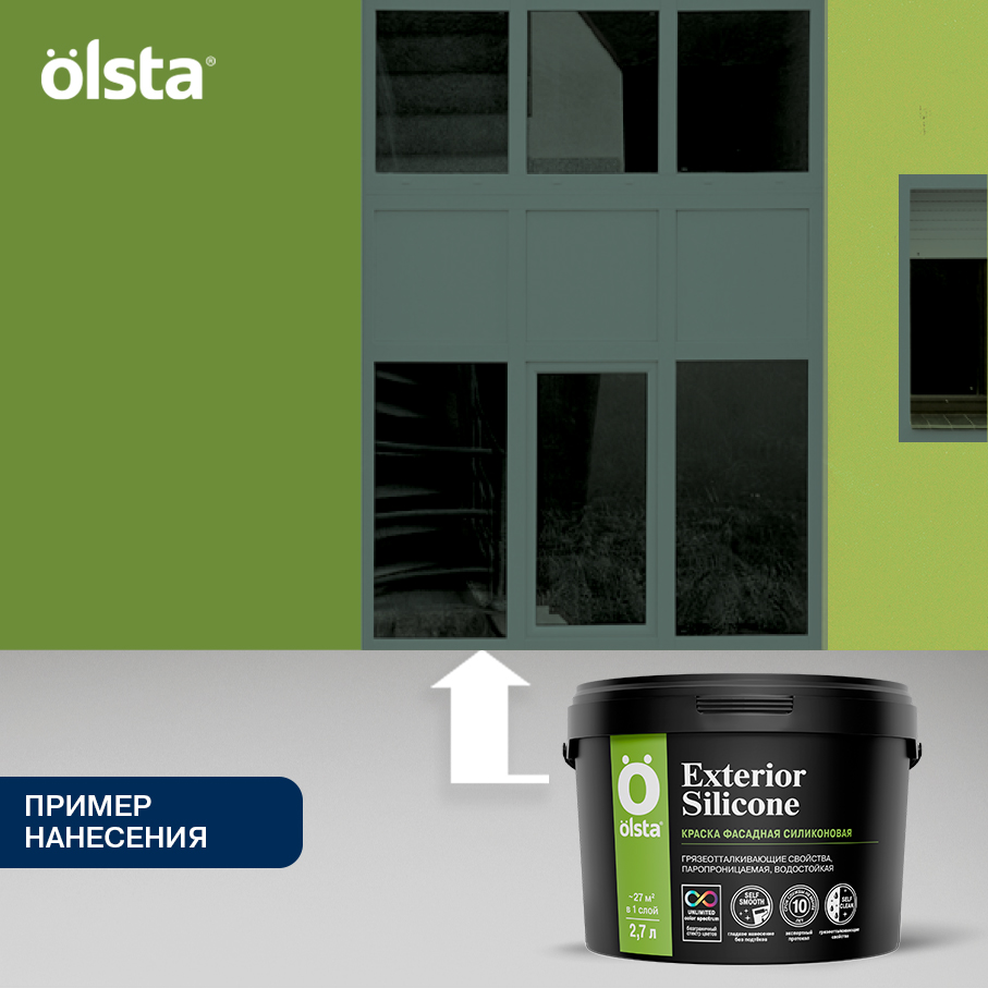 Фасадная краска Olsta Exterior Silicone разработана специально для отделки фасадов зданий, построенных в прибрежной зоне, а также на территориях с высоким уровнем загрязнения атмосферы. Продукт с силиконовыми добавками формирует прочное матовое покрытие, устойчивое к влаге и обладающее повышенными грязеотталкивающими и антисептическими свойствами.