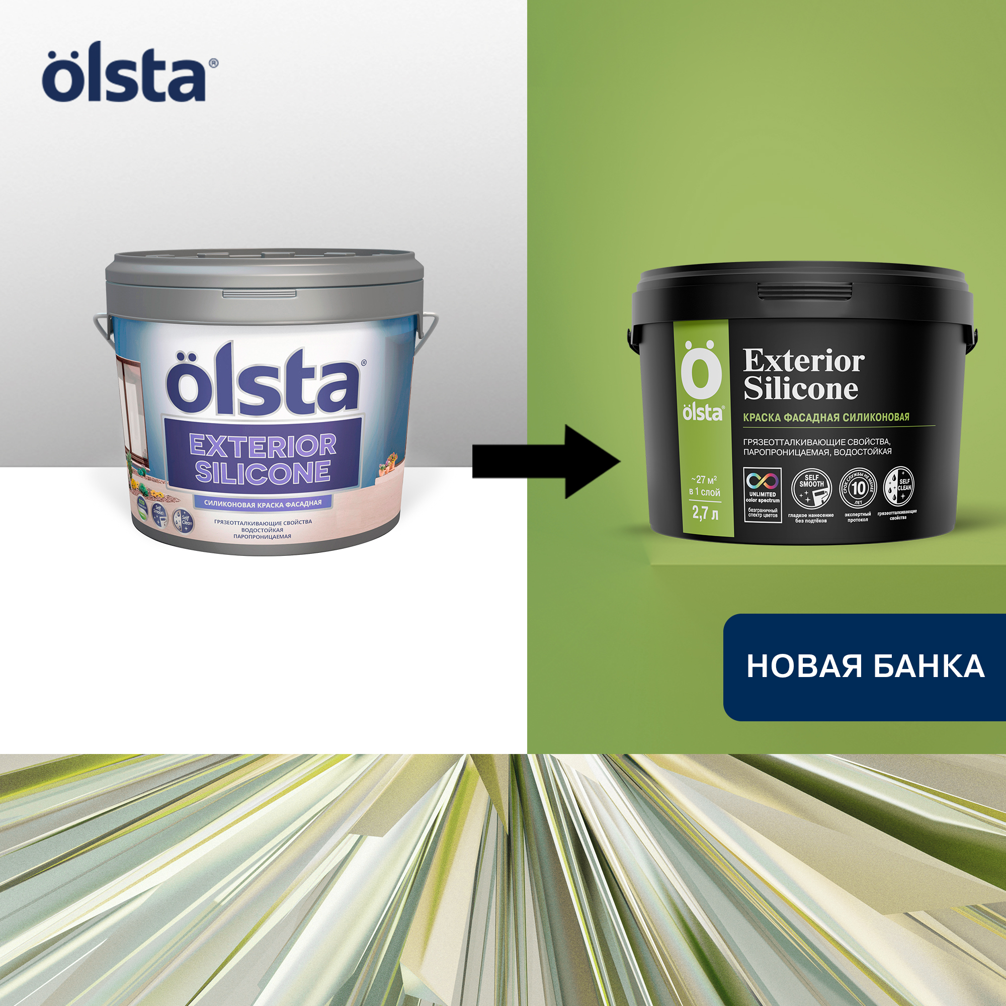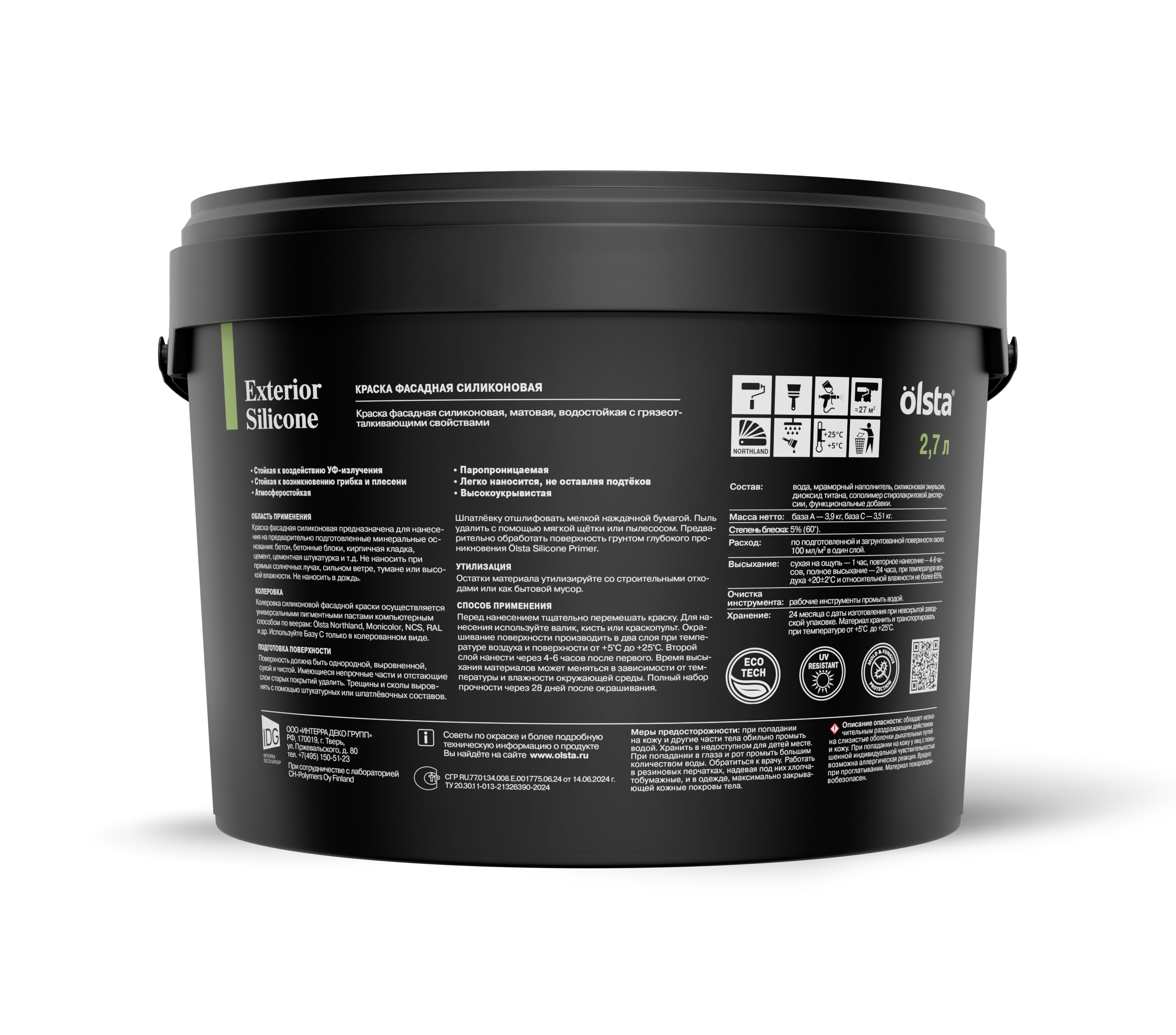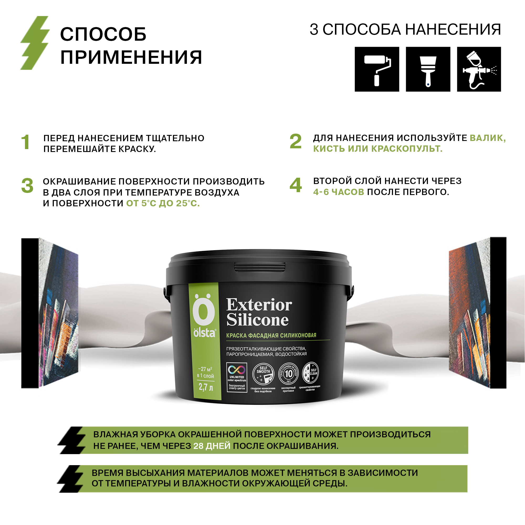 Фасадная краска Olsta Exterior Silicone разработана специально для отделки фасадов зданий, построенных в прибрежной зоне, а также на территориях с высоким уровнем загрязнения атмосферы. Продукт с силиконовыми добавками формирует прочное матовое покрытие, устойчивое к влаге и обладающее повышенными грязеотталкивающими и антисептическими свойствами.