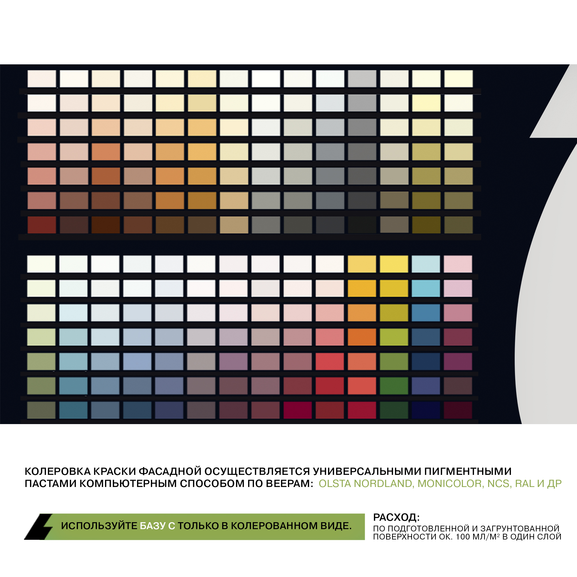 Колеровка краски фасадной осуществляется универсальными пигментными пастами компьютерным способом по веерам: Olsta Nordland, Monicolor, NCS, RAL и др.