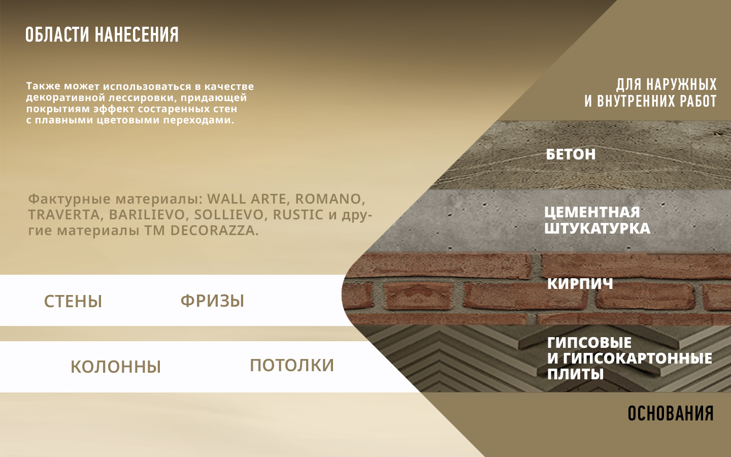 Применяется в качестве финишного декоративного покрытия для создания эффекта плавных цветовых переходов и придания особой выразительности фактурным покрытиям внутри и снаружи помещений.