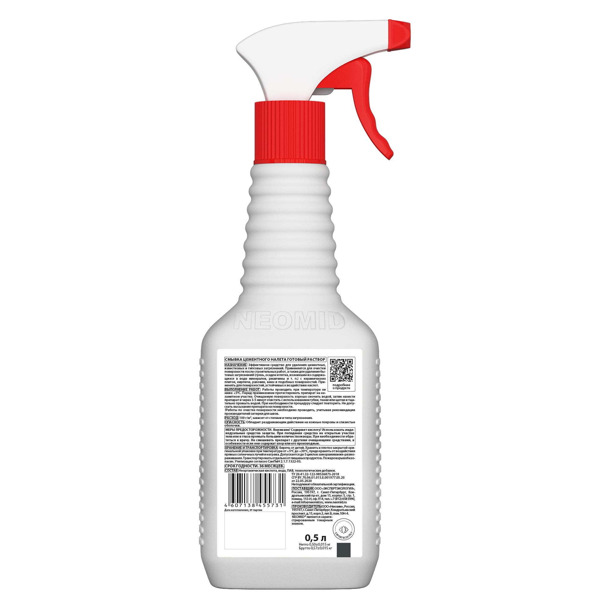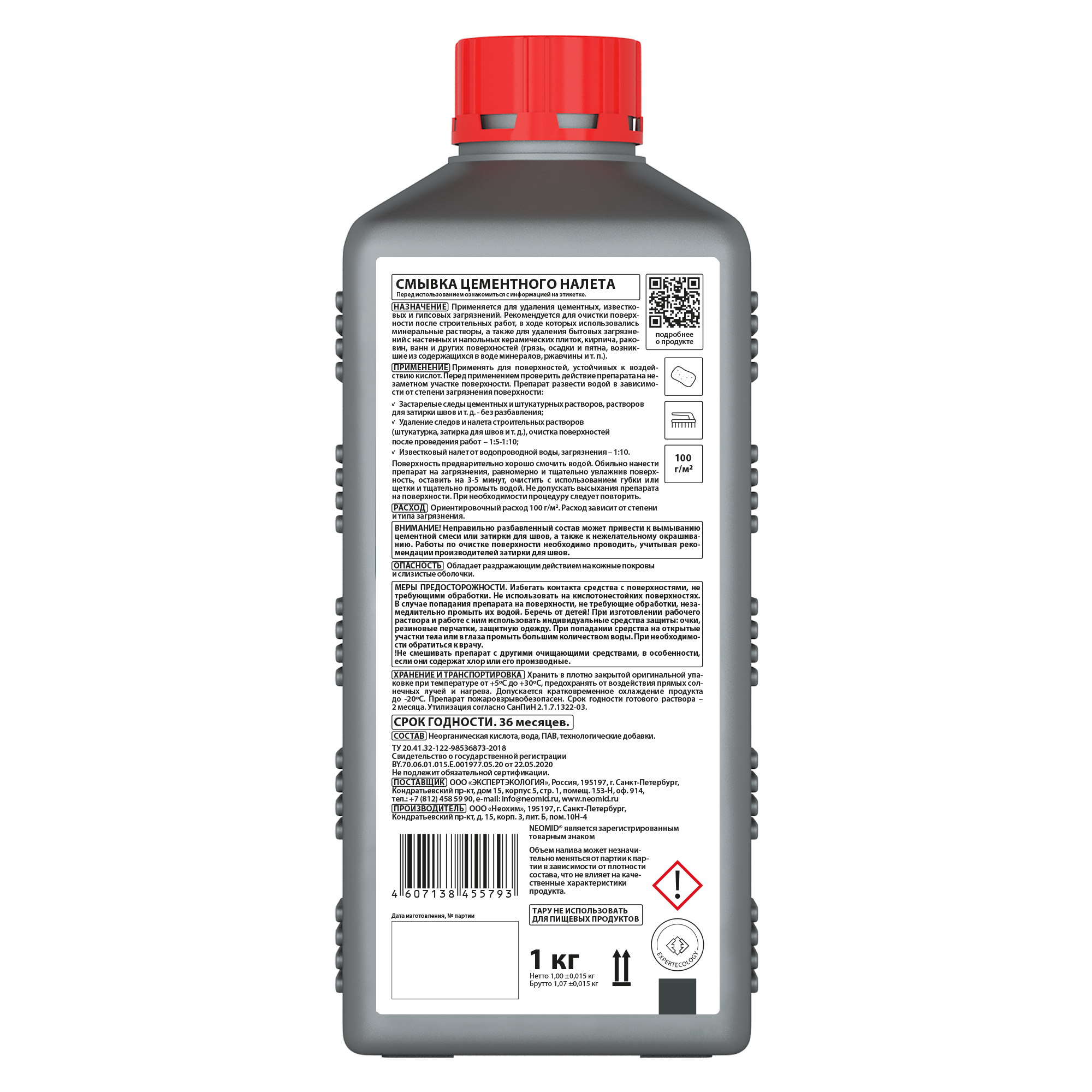 Тип продукта: NEOMID 560 - смывка цементного налета - Смывка цементного налета. Удаляет цементный и известковый налет с кирпича, бетона камня, керамической плитки и других минеральных поверхностей