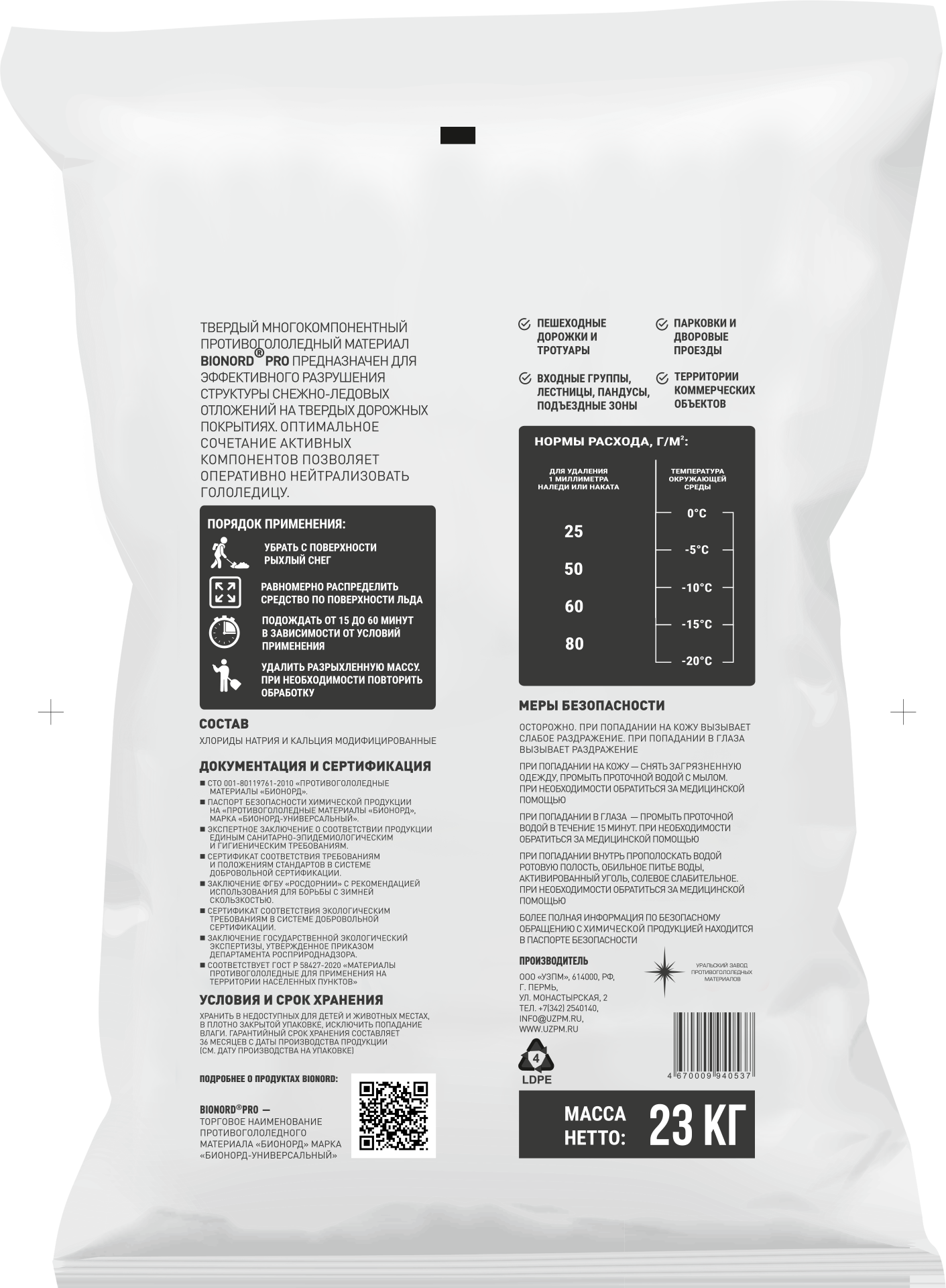 BIONORD PRO - средство эконом сегмента, обеспечивающее надёжную защиту от обледенения при температуре до –20 °C. Способствует эффективному таянию льда на любых поверхностях, рекомендован к применению на промышленных объектах. Эффективен на любых поверхностях. Идеальный вариант для клининговых компаний, занимающихся уборкой больших территорий складских и распределительных логистических центров. Обладает повышенной плавящей способностью и экономичностью в сравнении с традиционными ПГМ, солью, смесью соли и песка. Благодаря оптимальному соотношению веществ в составе быстро и эффективно разрушает лед при температуре до –20 °C на дорогах, в дворовых проездах, на территориях коммерческих объектов и других поверхностях, не требующих деликатного ухода. Производство противогололедного материала осуществляется по передовой технологии «Единая гранула». Поставляется в мешках 12 и 23 кг и МКР 800 кг.