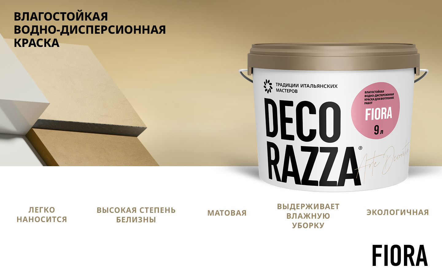 Тип продукта: Влагостойкая интерьерная краска FIORA - Интерьерная краска для стен и потолков, особо устойчивая к мытью и истиранию